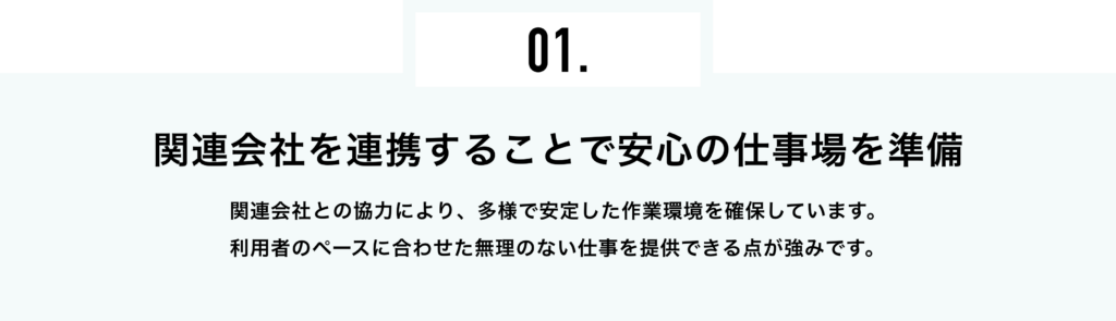 Home あなたらしく ここから始まる 新しい一歩 あなたらしく ここから始まる 新しい一歩 Mわーくすとは 平日は一般のお仕事(PC作業や体を動かすお仕事など)休日はアマチュアスポーツのカメラマンの仕事を通して楽しみながら無理なく社会復帰を目指せる場所です。 Mわーくすのポリシー -高賃金へのこだわり- 代表理事 名前名前 テキストテキストテキストテキストテキストテキスト テキストテキストテキストテキストテキストテキスト テキストテキストテキストテキストテキストテキスト テキストテキストテキストテキストテキストテキスト 代表理事 名前名前 テキストテキストテキストテキストテキストテキスト テキストテキストテキストテキストテキストテキスト テキストテキストテキストテキストテキストテキスト テキストテキストテキストテキストテキストテキスト 就労支援B型とは? 就労継続支援B型は、障がいや体調の影響などで一般企業で働くことが難しい方が、自分のペースで働きながらスキルを身につけることができる福祉サービスです。利用者は雇用契約を結ばず、作業内容や勤務時間を自分に合わせて調整できるのが特徴です。施設では、軽作業や製品づくり、データ入力など、さまざまな仕事を通して「できること」を増やしていきます。働く喜びを感じながら、生活リズムを整えたり、将来のステップアップを目指したりする場として、多くの方が利用しています。 こんなお悩みのある方へ おすすめの事業所です 楽しい仕事がしたい 高い工賃で働きたい 精神状態を安定させたい 楽しい仕事がしたい 安心して働きたい 理解のある職場で働きたい いつか就職したい より健康になりたい 家近の事業所を探している 私たちの特徴 詳細はこちら ▶︎ 1日の流れ お知らせ 投稿テスト06 投稿テスト05 投稿テスト04 投稿テスト03 投稿テスト02 投稿テスト 1 2 › お知らせ一覧へ ▶︎