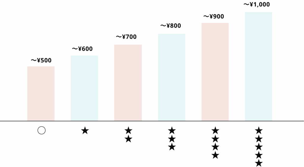 工賃例 工賃例 1日2時間、20日利用の場合(施設内就労) ¥600(1日工賃) × 20(日) = ¥12,000 (/月) 1日4時間、休日8日利用の場合(施設外就労) ¥2,000(1日工賃) × 8(日) = ¥16,000 (/月) 1日2時間、20日利用の場合(施設外就労) ¥1,000(1日工賃) × 20(日) = ¥20,000 (/月) 1日2時間、20日利用の場合(施設外就労) ¥1,600(1日工賃) × 20(日) = ¥32,000 (/月) 1日2時間、12日利用(施設内就労)1日4時間、20日利用の場合(施設外就労) ¥600(1日工賃) × 12(日) + ¥2,000(1日工賃) × 8(日) = ¥20,000 (/月) 頑張れる秘訣!評価制度 みらいるわーくすでは、安心の評価制度があります。★を集めることで1日あたりの工賃がアップします。日々、数字で頑張りを実感できる仕組みとして評価制度を導入しております。 みらいるわーくすでは、安心の評価制度があります。 ★を集めることで1日あたりの工賃がアップします。 日々、数字で頑張りを実感できる仕組みとして評価制度を導入しております。